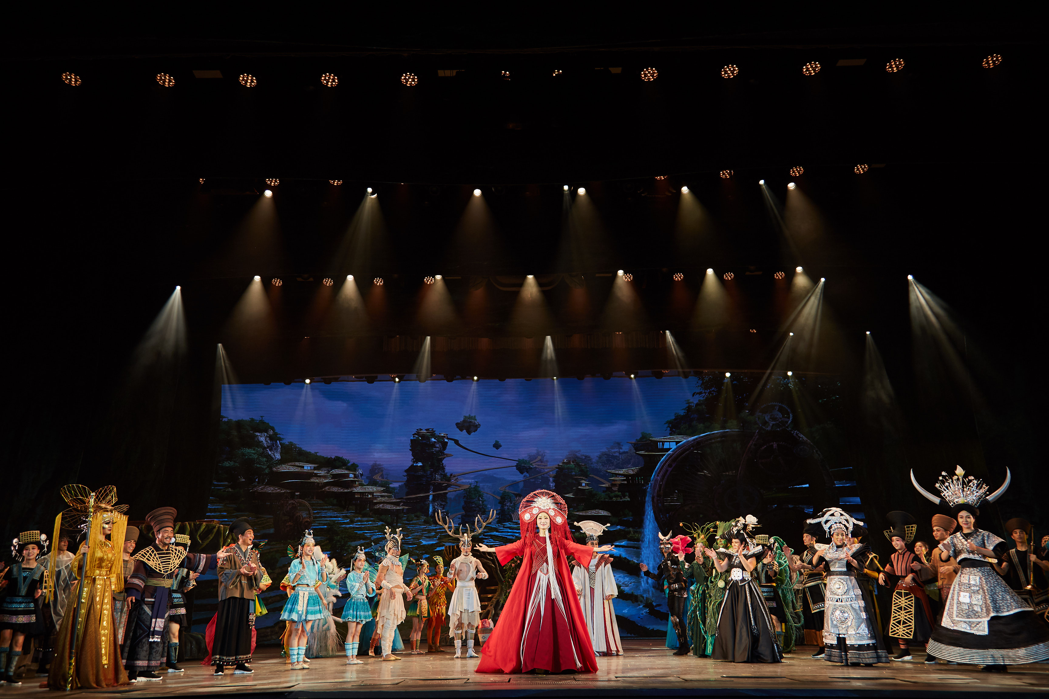 身著婚禮盛裝的青年鹿與“橋“在村民的簇擁下出現(xiàn)在舞臺上,村民、觀眾與萬物生靈齊聚舞臺,村長宣布婚禮開始,二位新人一敬天地、二敬父母、三敬觀眾,婚禮禮成,新人為受邀的觀眾斟上傳統(tǒng)的高山流水酒,在喜慶熱鬧的《干一杯》音樂中,眾人舉杯,村民、生靈與觀眾們開始了狂歡。