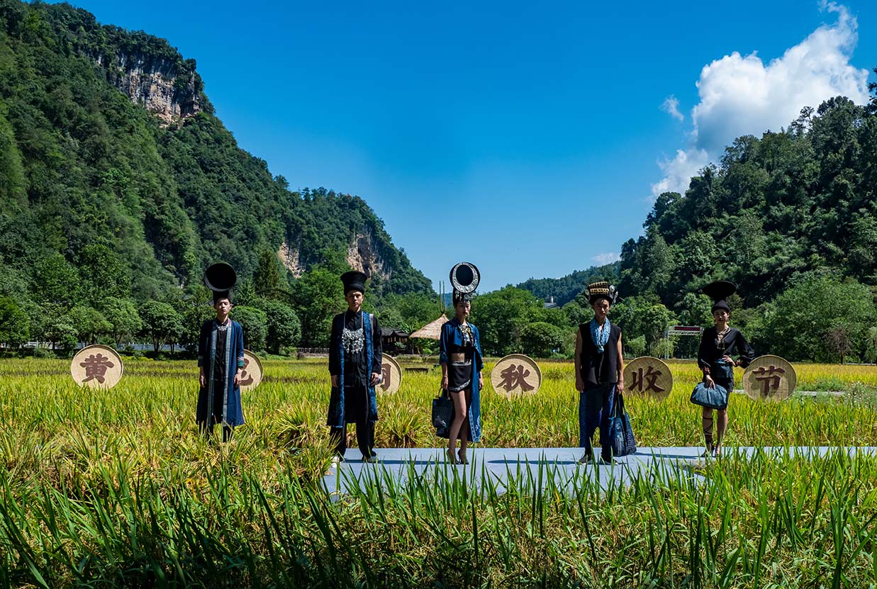 9月19日,在湖南省張家界市武陵源區(qū)黃龍洞景區(qū)生態(tài)稻田,景區(qū)工作人員身著民族時尚服飾在金黃的稻田間走秀,